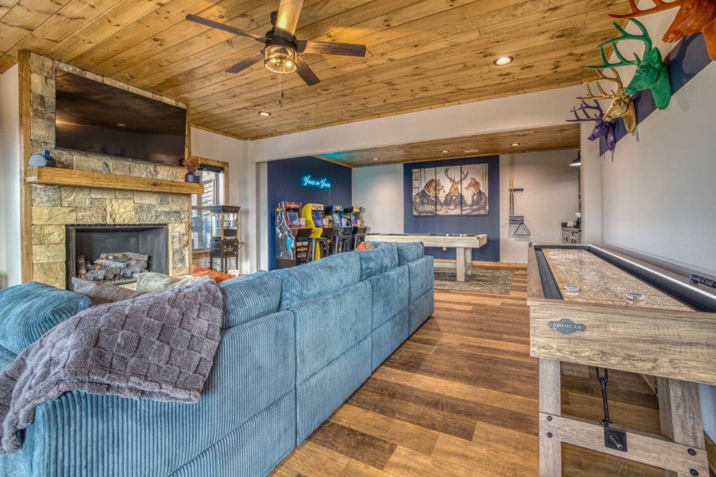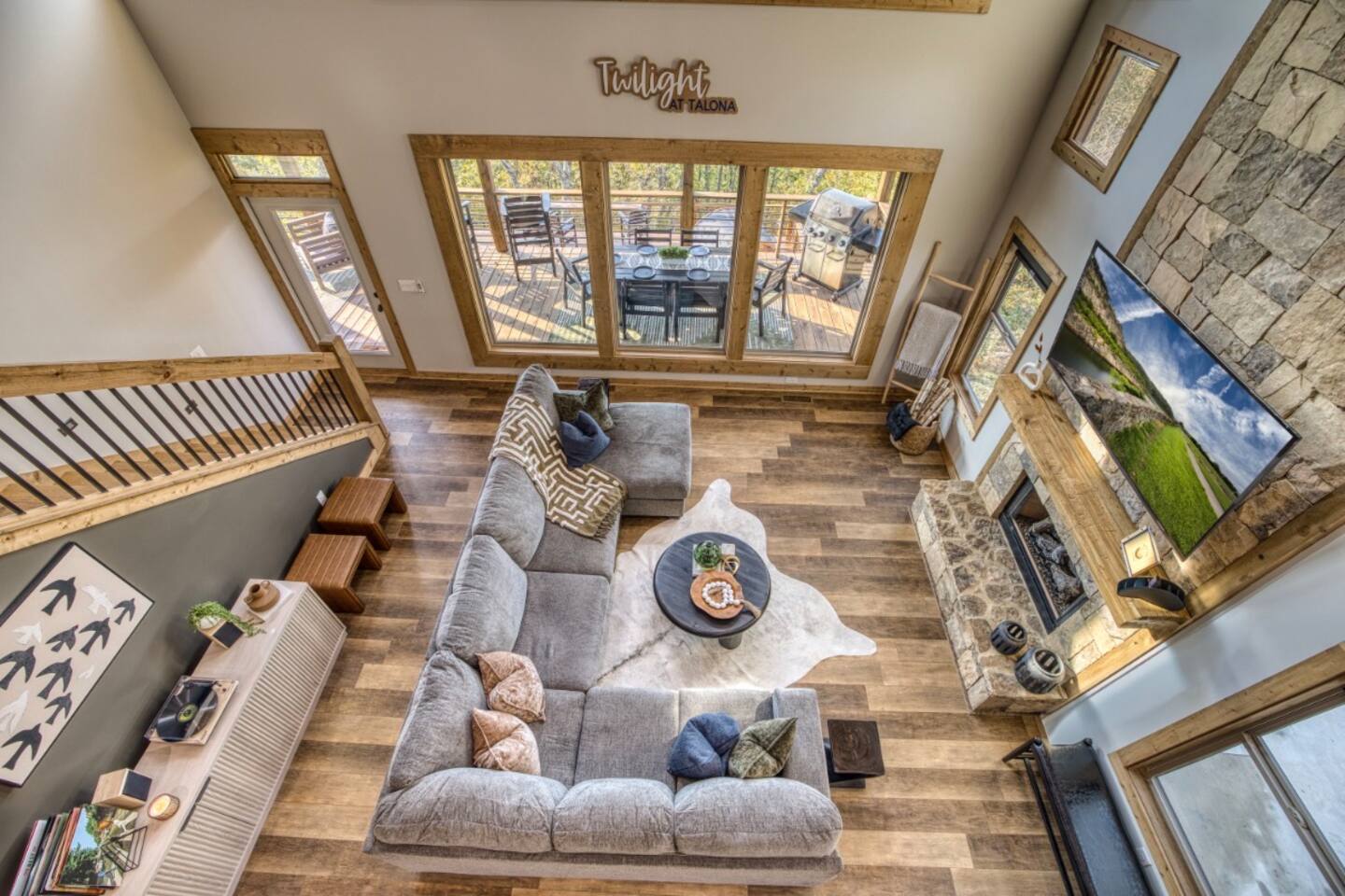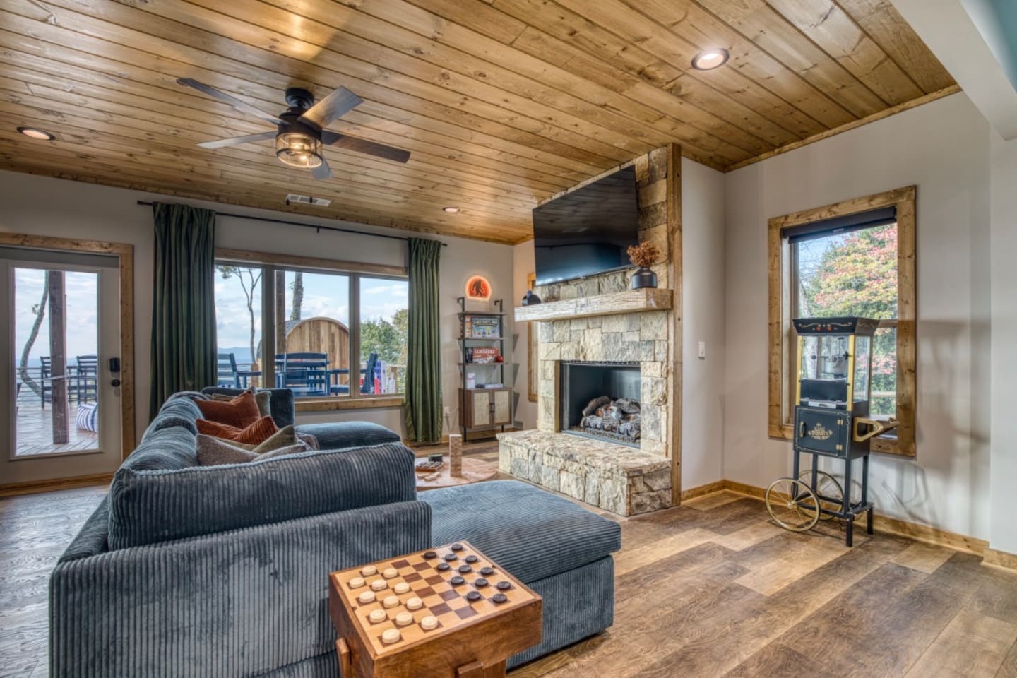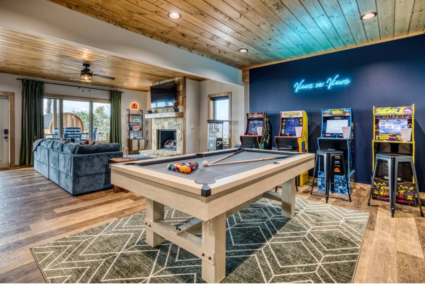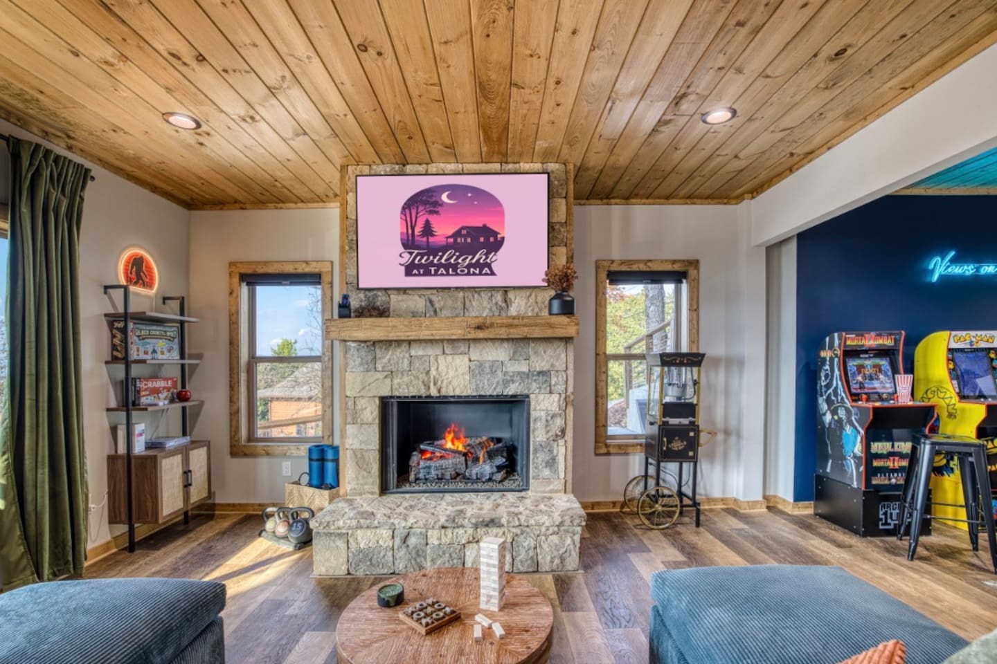 Twilight at Talona is thoughtfully designed for comfort, privacy, and relaxed mountain living. The cabin features spacious gathering areas balanced with quiet retreats, making it ideal for families and groups traveling together. Inside, open living spaces invite connection, while plush king and queen beds throughout the home ensure restful nights after a day of exploring or unwinding. A dedicated game room adds an element of fun, and multiple living areas allow everyone to spread out comfortably. The layout offers a sense of separation and flow, so guests can enjoy time together without feeling crowded. Every space is designed to feel warm, inviting, and intentional—perfect for slowing down and settling in.