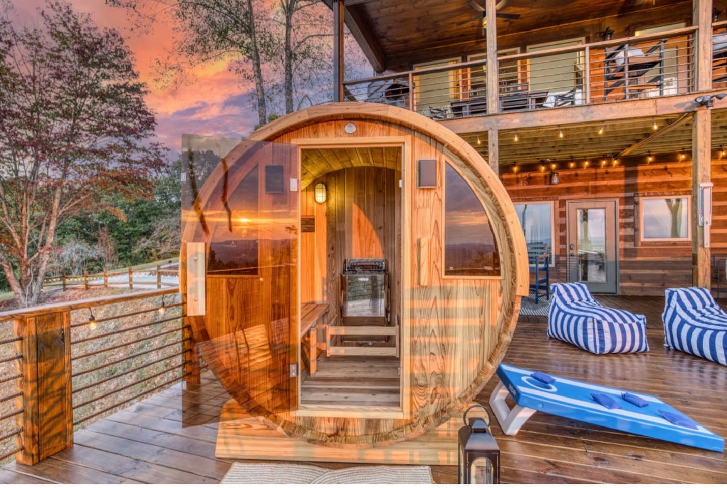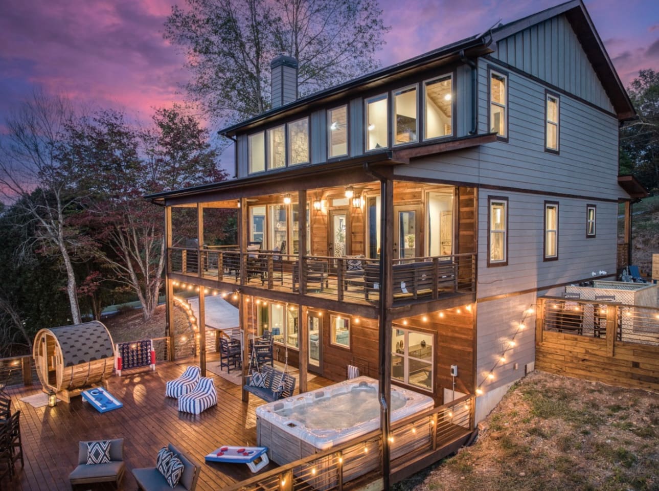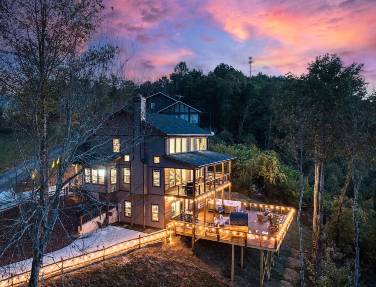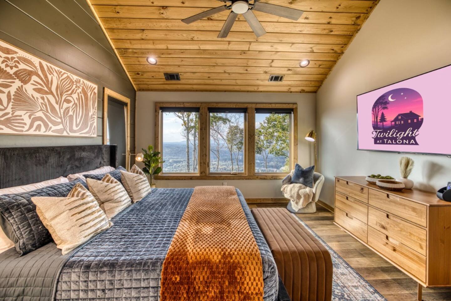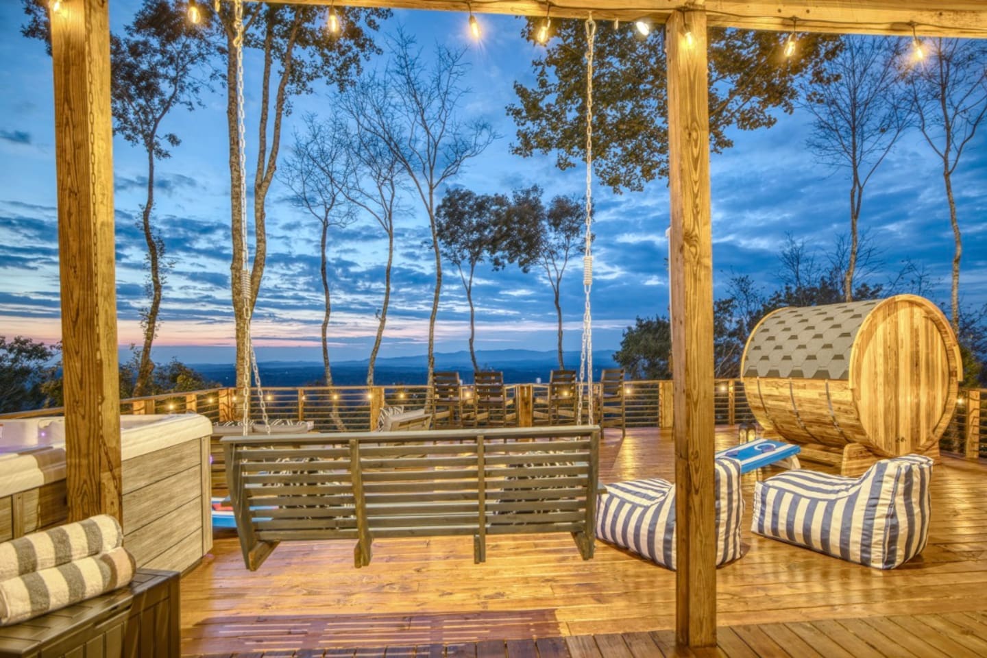 Welcome to Twilight at Talona, a private mountaintop retreat in Ellijay with sweeping mountain and sunset views. This thoughtfully designed cabin blends modern comfort with peaceful seclusion, featuring plush king and queen beds, spacious living areas, a game room, and serene outdoor spaces. Unwind in the 11-person hot tub, relax in the barrel sauna, or enjoy quiet evenings surrounded by nature—just minutes from downtown Ellijay.